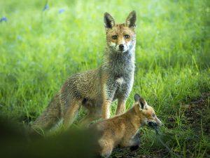 This was both exciting and frustrating! I noticed some movement to the left of me and when I looked it was ‘father’ fox, walking toward the den, with a bird in it’s mouth. It had obviously brought some food for the cubs. I say frustrating because at that exact moment I was changing the SD card in the trail camera, so I had to quickly put it down, pick up my camera and hope to get photos of the fox feeding the cub. By doing this though, the fox noticed me! He decided to make a quick exit leaving the food ( a bird), with one of the cubs. The cub by the way hadn’t noticed me; it was far more interested in father and food!